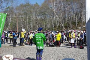 参加者約100名のうち、8割が4キロコース、2割が10キロコースという形に分かれ、全部で10班編成でツアー開始となりましたが、それぞれのコースでミズバショウ、カタクリ、リュウキンカなどの花々が随所に咲きほこり、カメラにその様子を収める方の姿も多く見られました。また、夢見平湿原や六美展望台での絶景に感嘆の声も上がっていました。